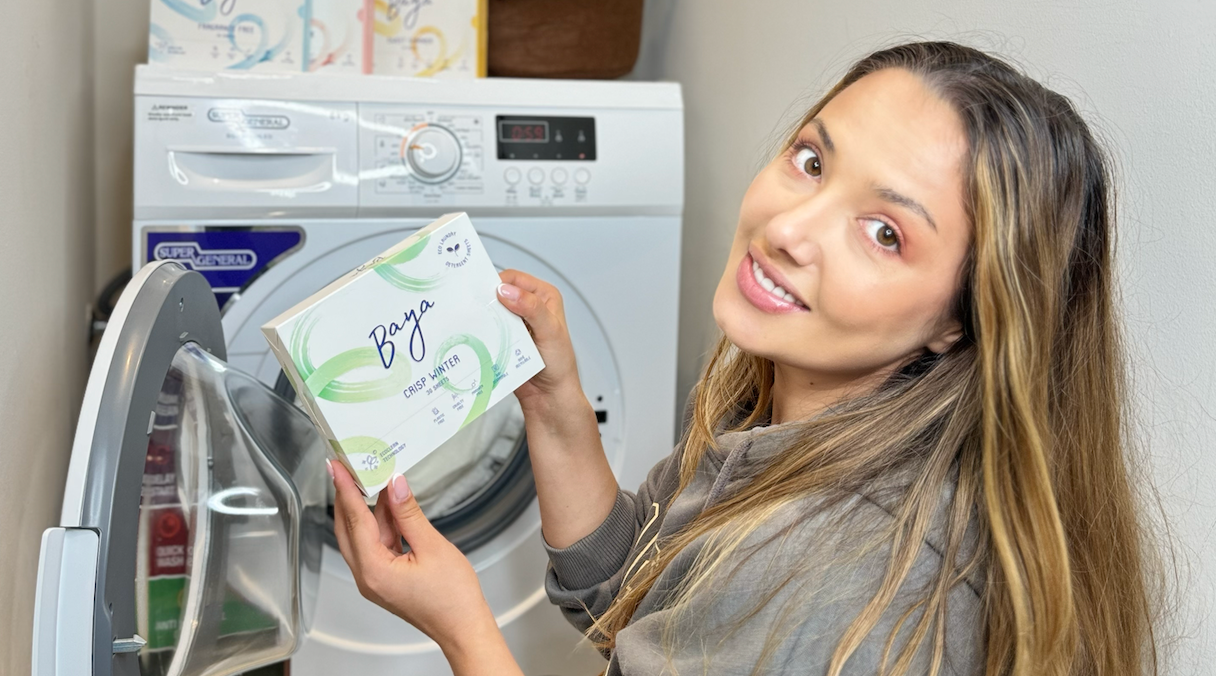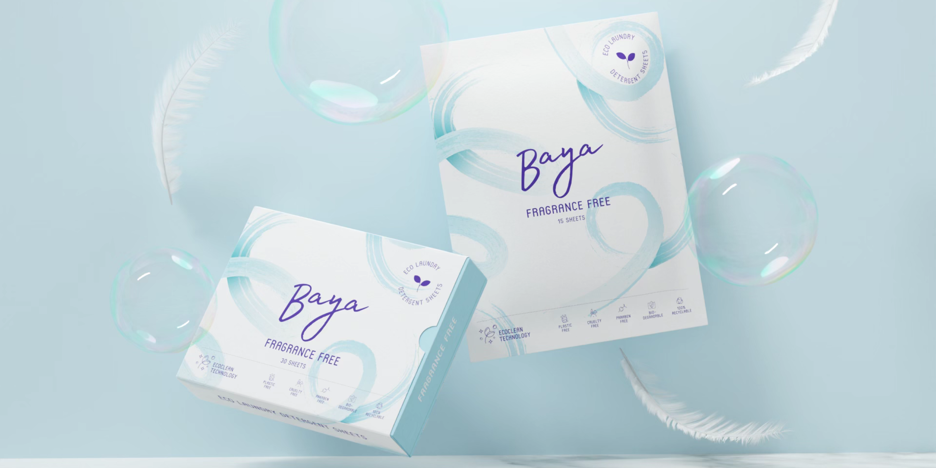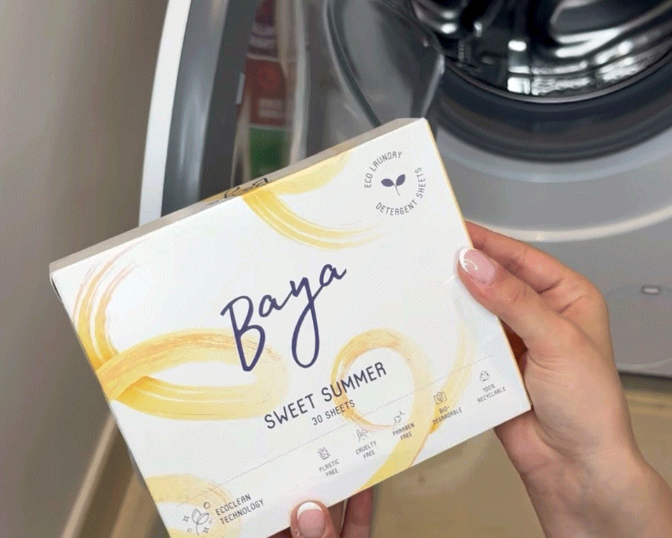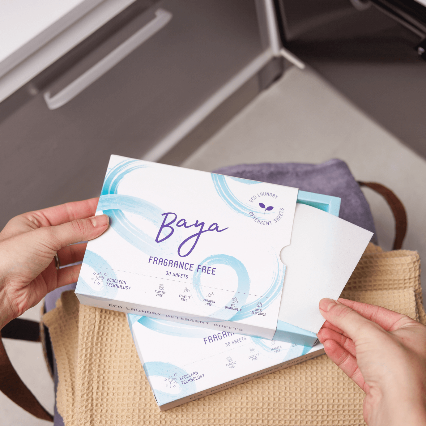 Replacing liquid or powder detergent, Baya comes as a thin sheet packed with powerful enzymes and essentials oils, removing the toughest stains.