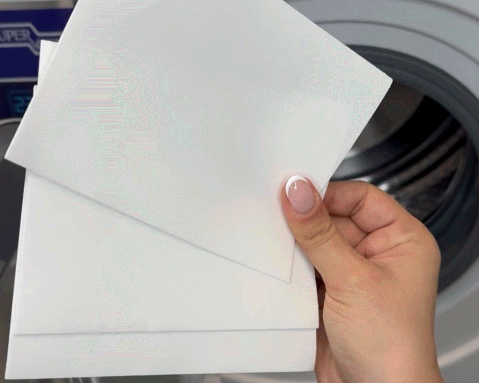 Add the sheets inside the washing machine, and place your laundry on top. The sheets will dissolve immediately at the contact with water, cleaning your laundry.
