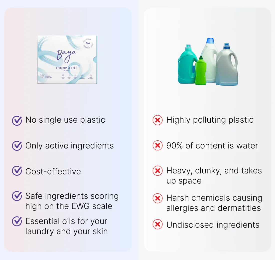 Did you know that up to 90% of liquid laundry detergent is water used as a filler? Baya is perfectly measured and highly concentrated, so you end up saving money.