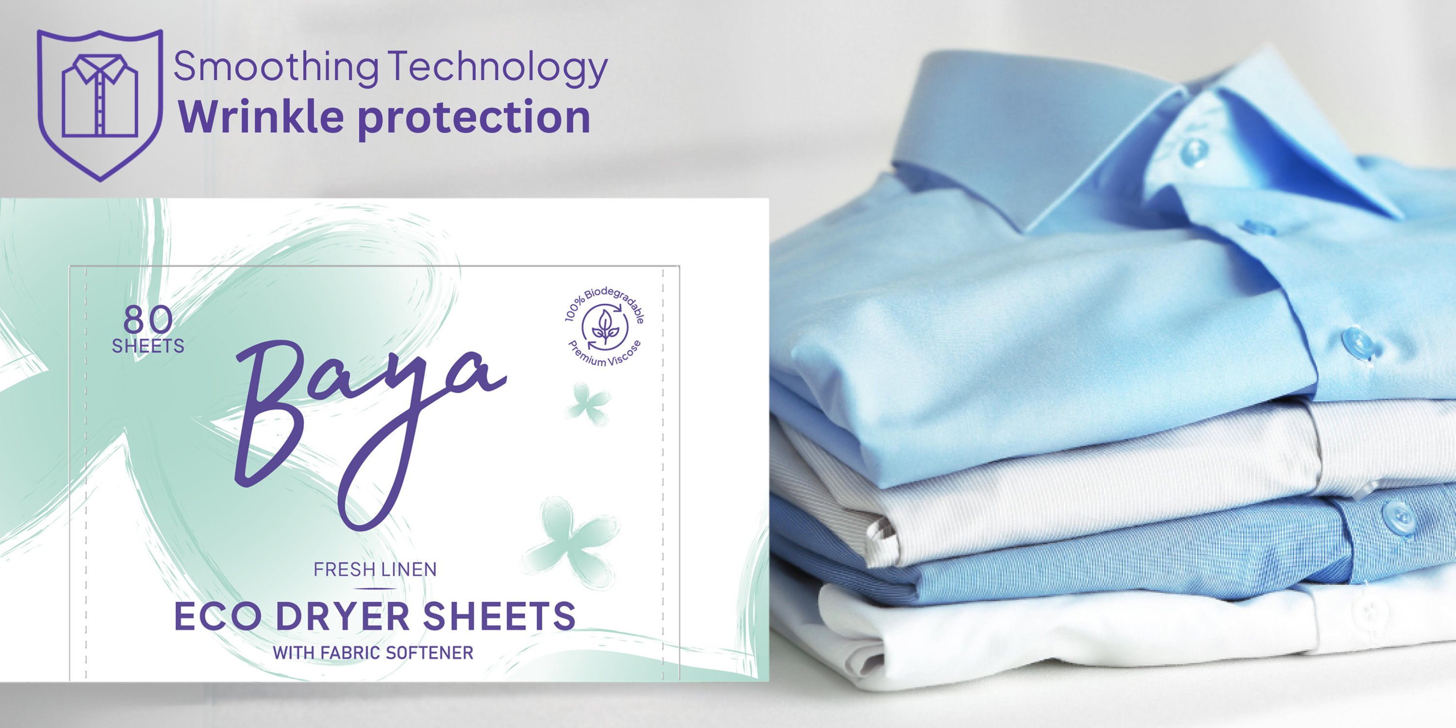 100% Viscose: Baya’s dryer sheets are 100% biodegradable and made from organic viscose, making them a perfect choice for the environmentally conscious.